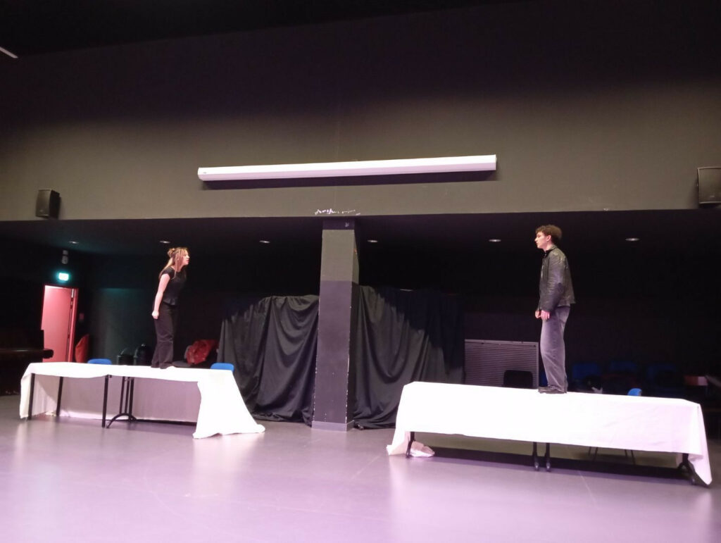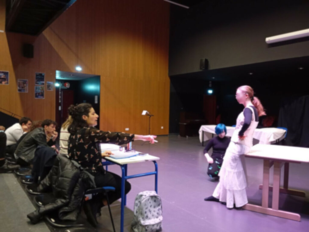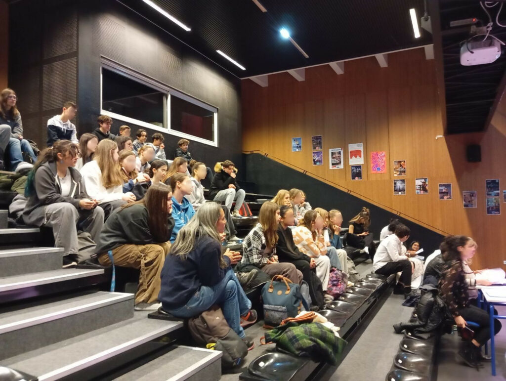Nous avons ensuite pu assister aux répétitions des élèves de la Spécialité Théâtre en classe de Terminale. Un travail au plateau en présence de l’intervenante théâtre où les élèves de 3ème ont pu mesurer à quel point le travail d’interprétation passe par l’action et le corps. Souvent interrompus par la comédienne qui leur a demandé de faire et refaire avec de nombreuses indications de jeu, les apprentis comédiens ont remis sur le métier leur ouvrage avec la même énergie.
